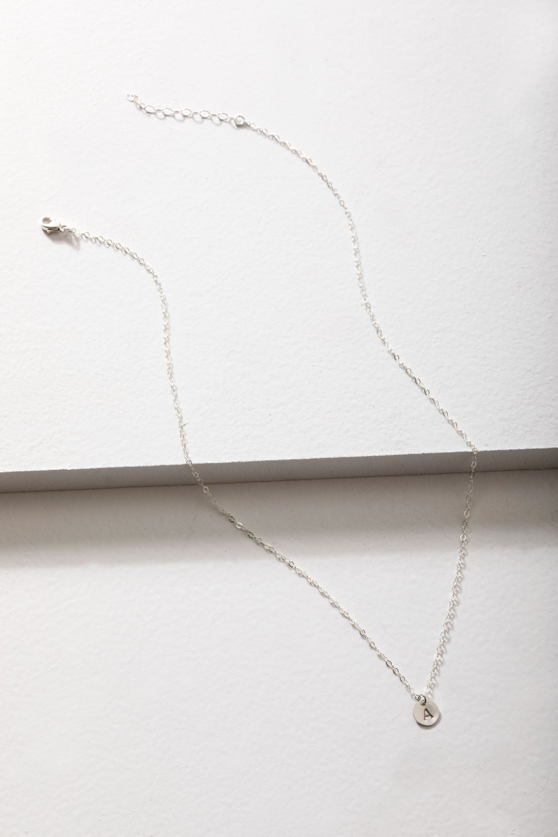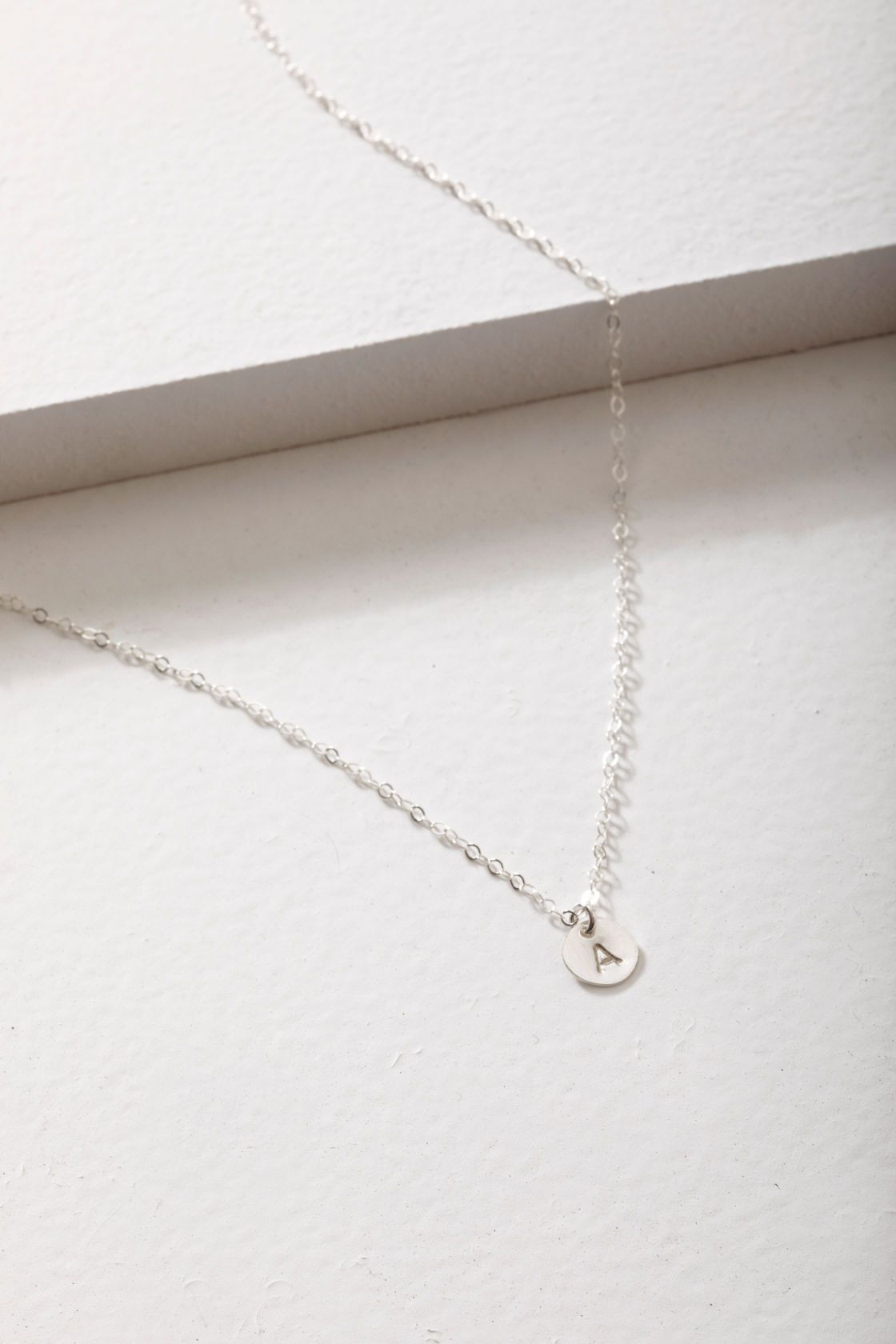 A hand-stamped initial pendant on a 14k gold-filled chain. Also available in 14K rose gold-filled and sterling silver.