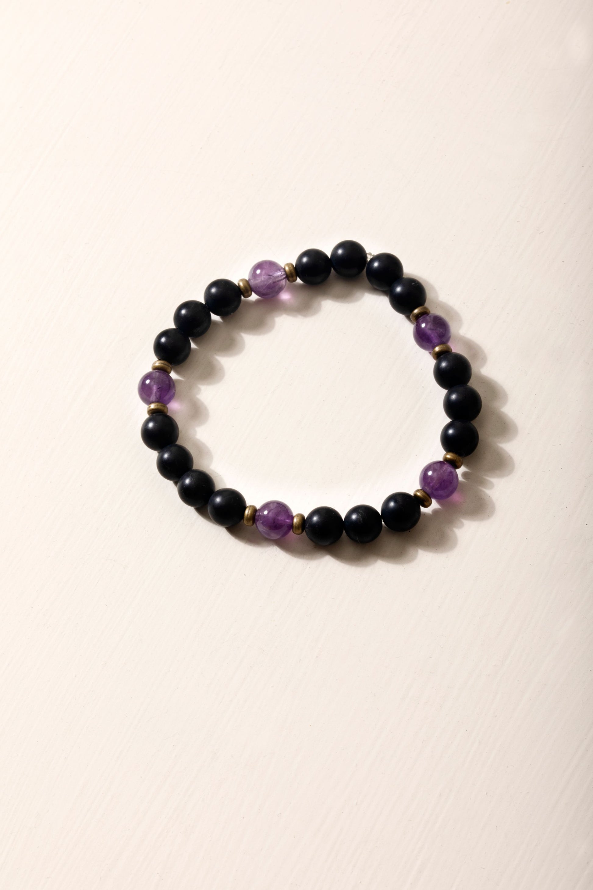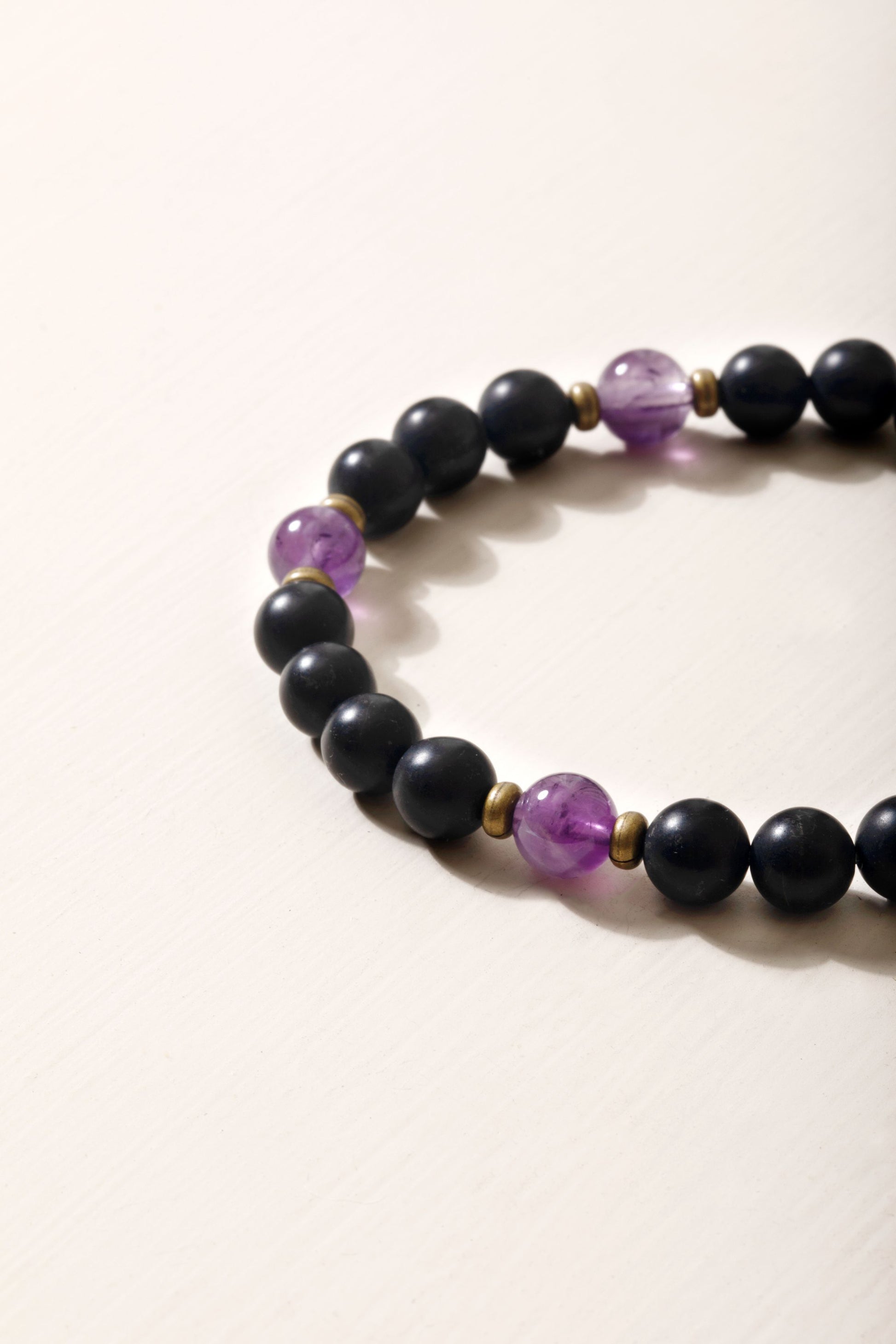This bracelet features Amethyst and Black Onyx. Accent spacers are available in brass or silver plated brass.