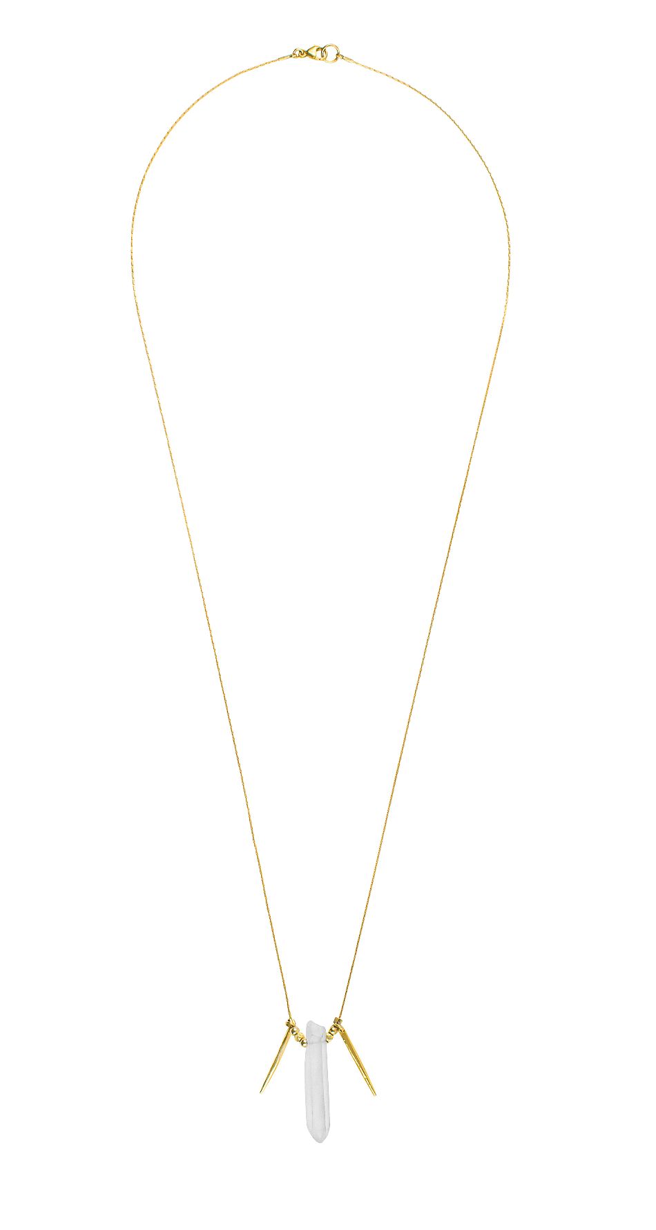The stunning Aiko crystal necklace is adorned with clear quartz, and is made with gold flake spheres and nuggets. Available in 14k Gold filled.