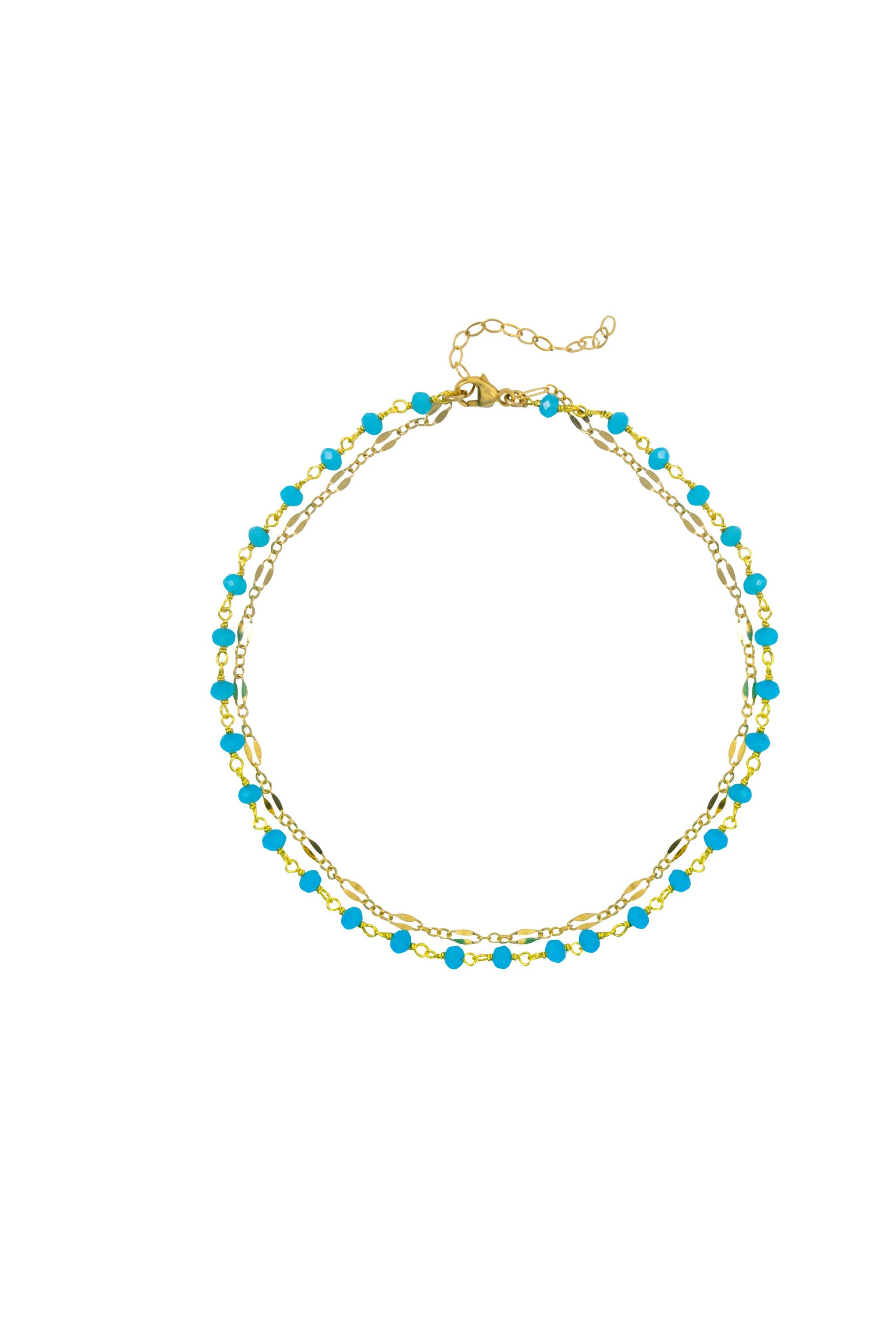 This layered anklet brilliantly combines delicately wire wrapped blue chalcedony stones with a sequined accent chain. Available in 14k gold vermeil or sterling silver.