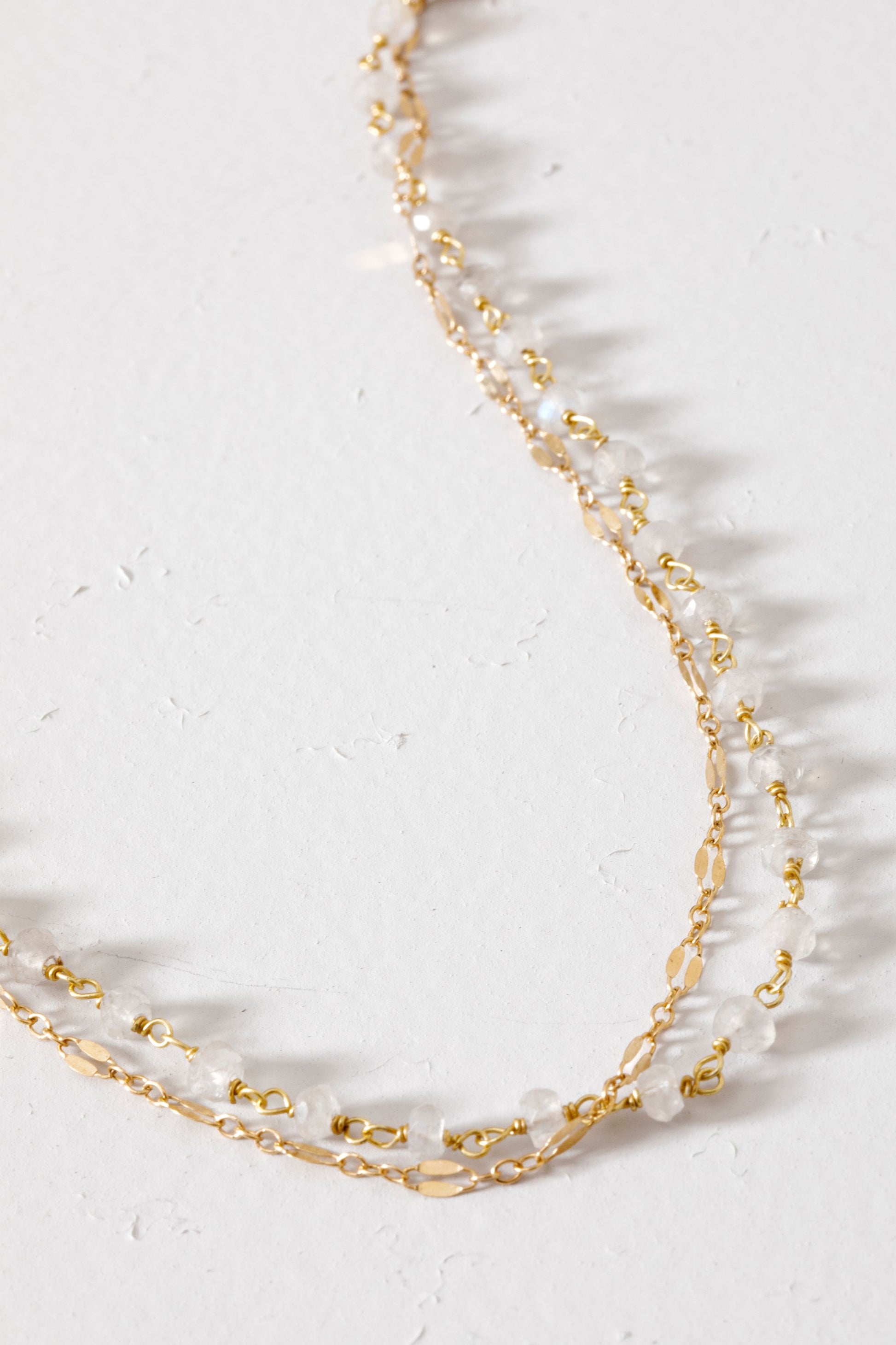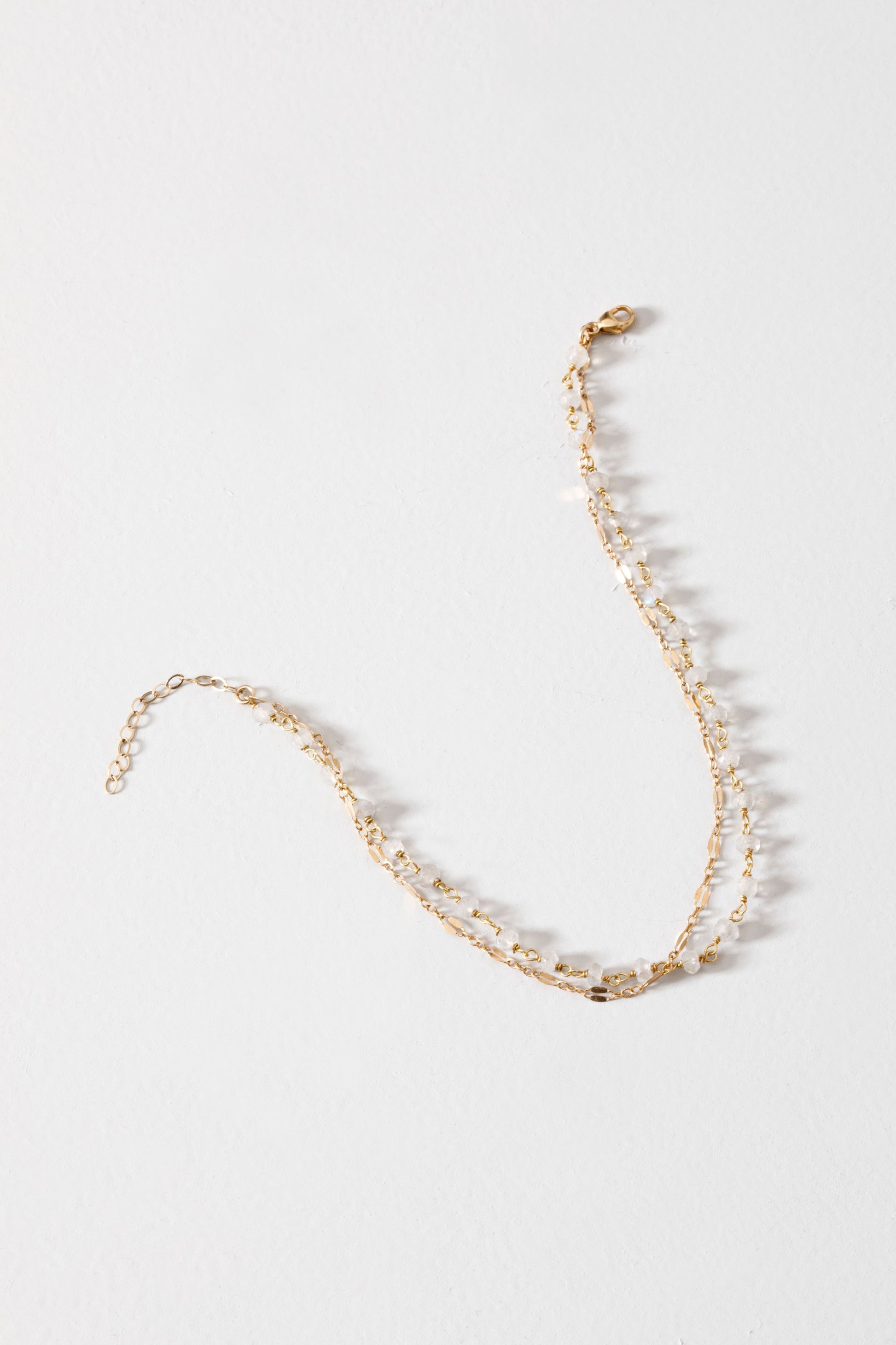 This layered anklet brilliantly combines delicately wire wrapped moonstones with a sequined accent chain. Available in 14k gold vermeil or sterling silver.