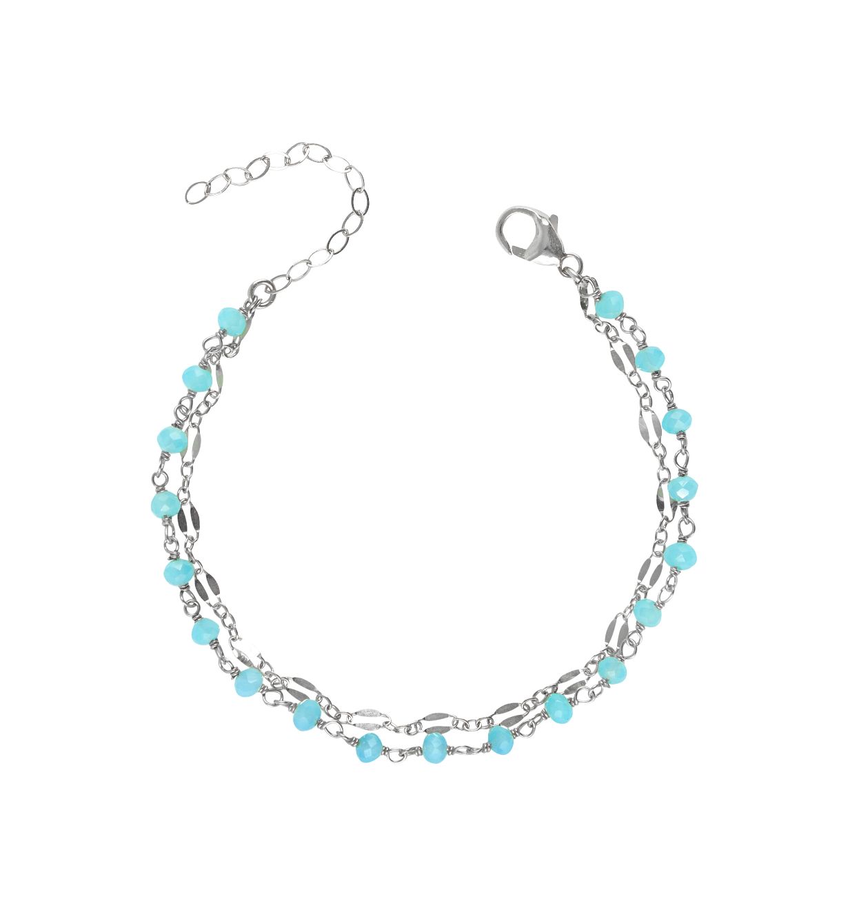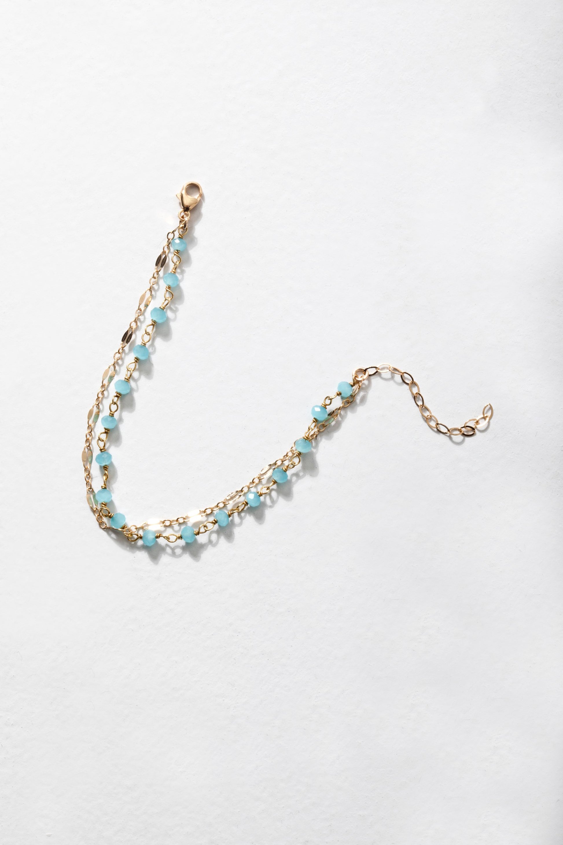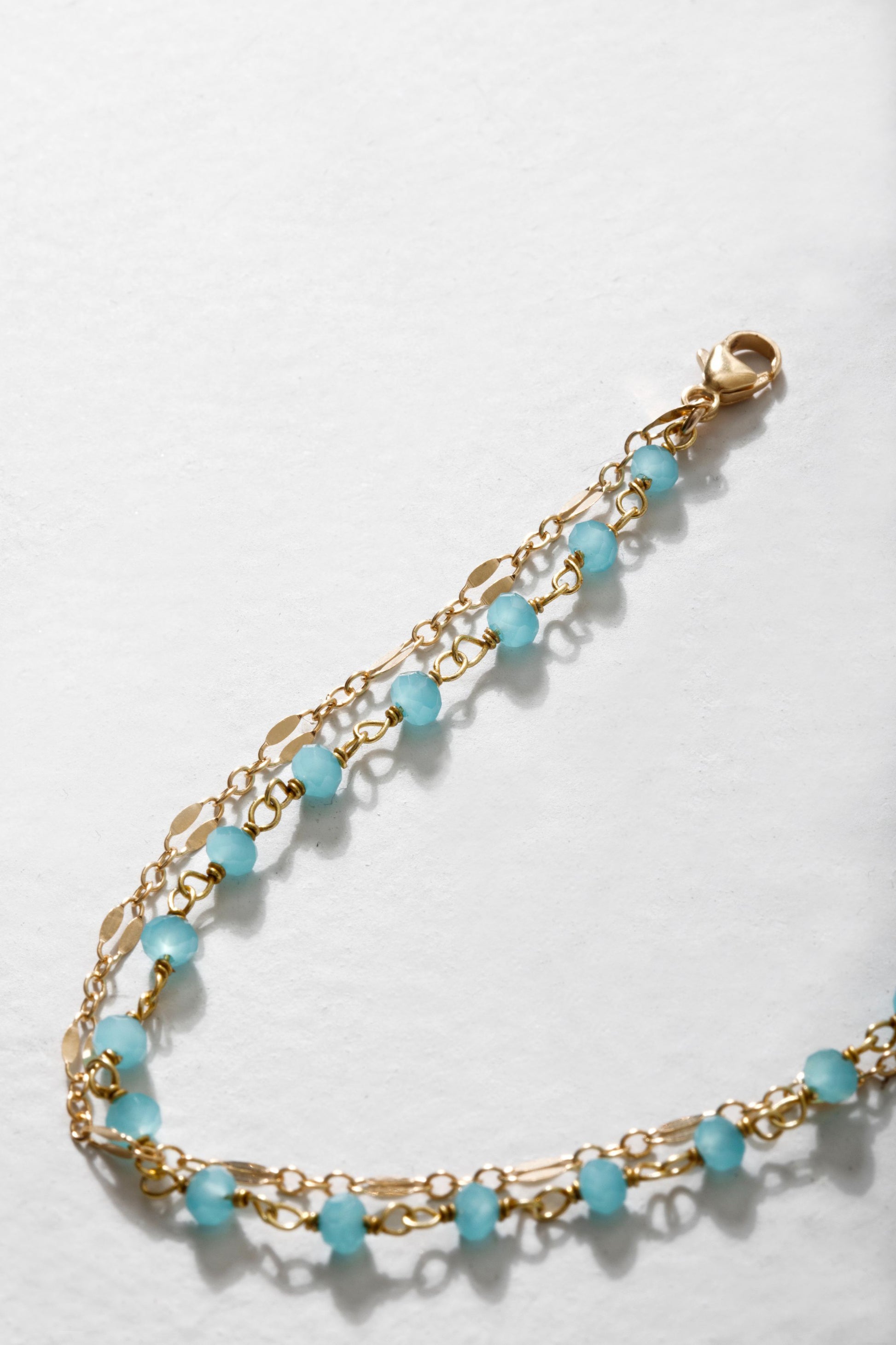 This layered bracelet brilliantly combines delicately wire wrapped blue chalcedony stones with a sequined accent chain. Available in 14k gold vermeil or sterling silver.