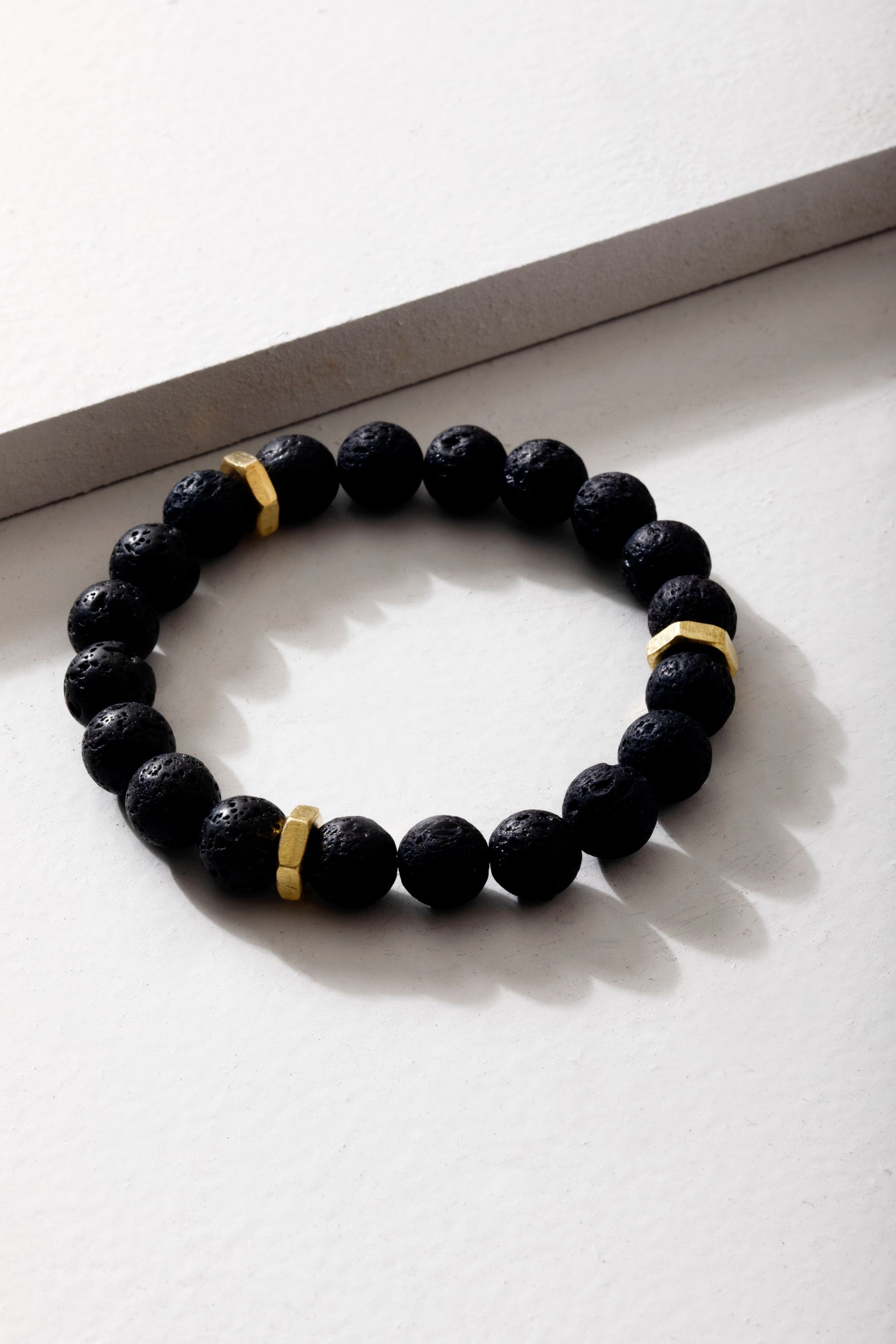 This bracelet is made with volcanic rock stones and brass nuts - a very industrial style piece.