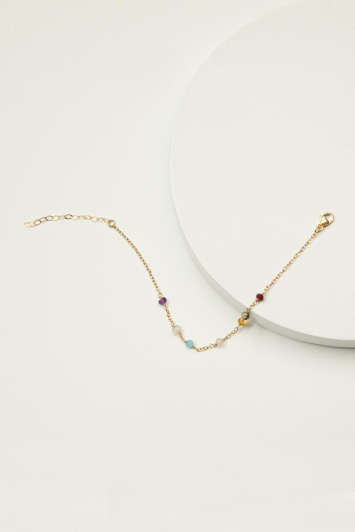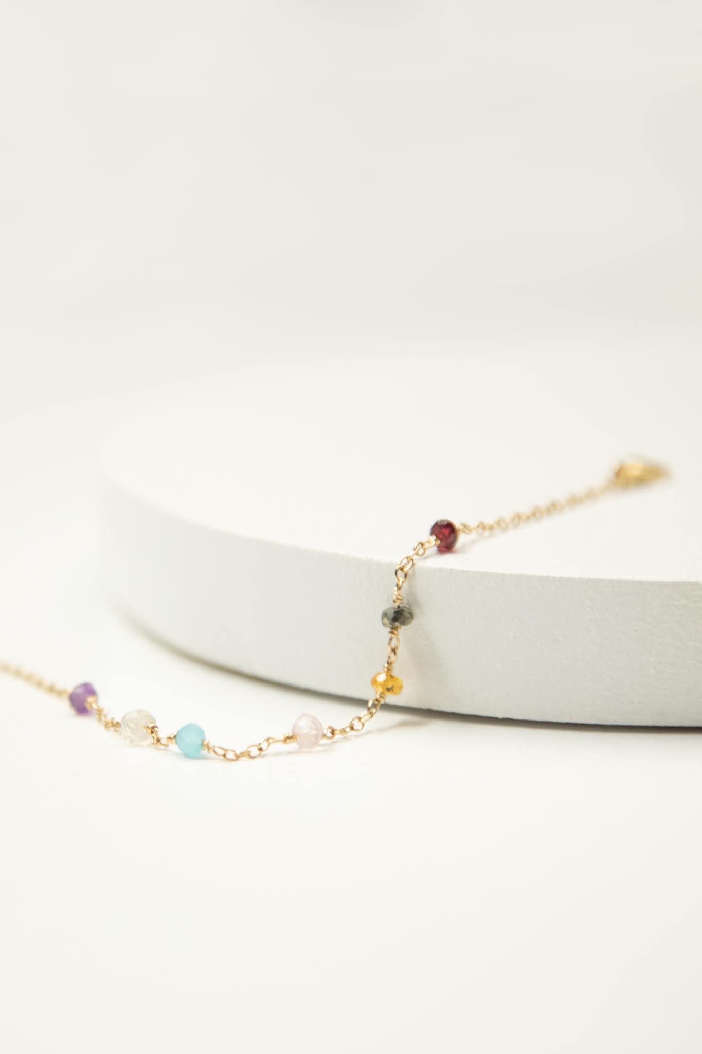 This bracelet features various chakra stones (amethyst, blue chalcedony, garnet, moonstone, rose quartz, pyrite, and orange opal) delicately hand-wrapped. Available in sterling silver, or 14k gold-filled.