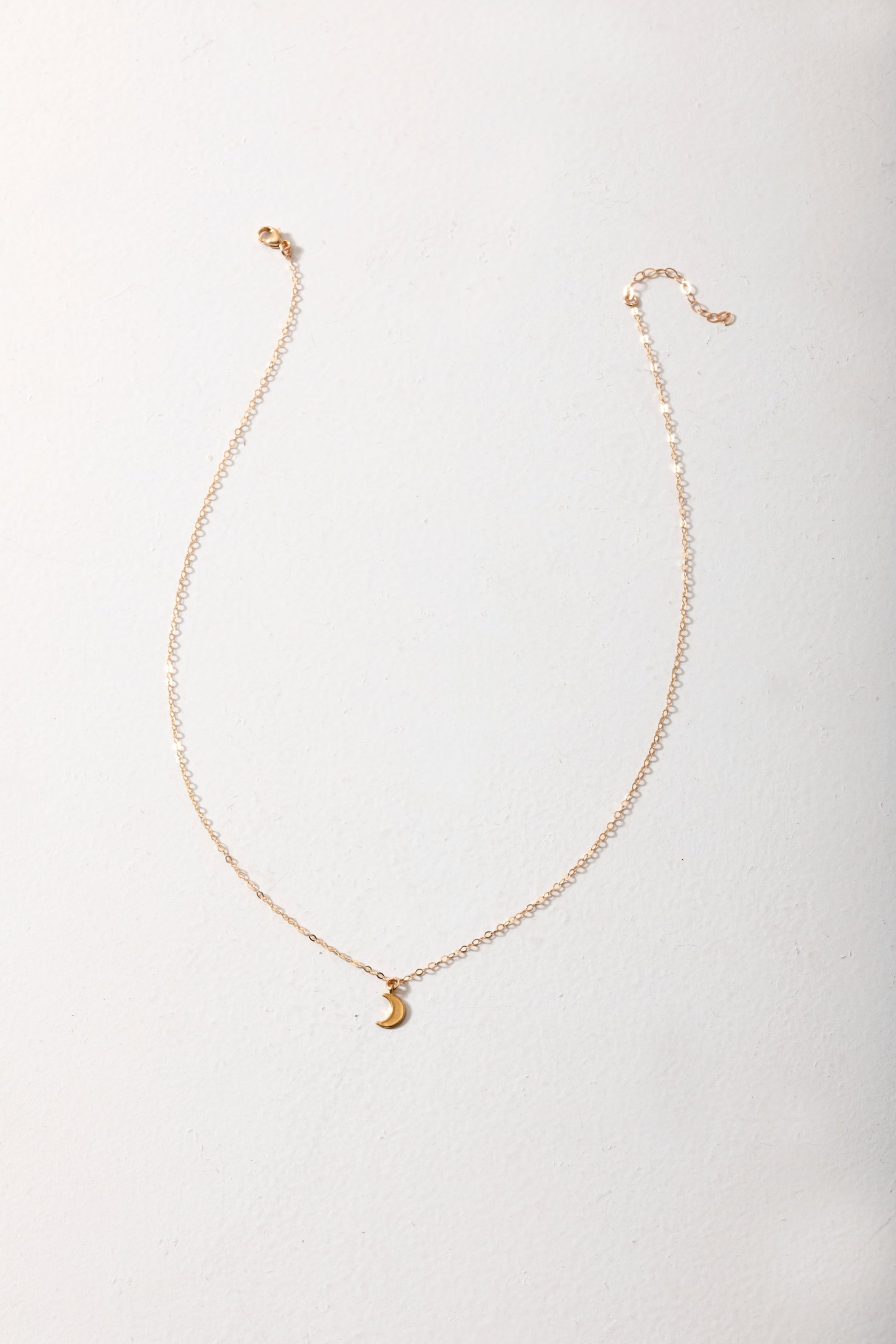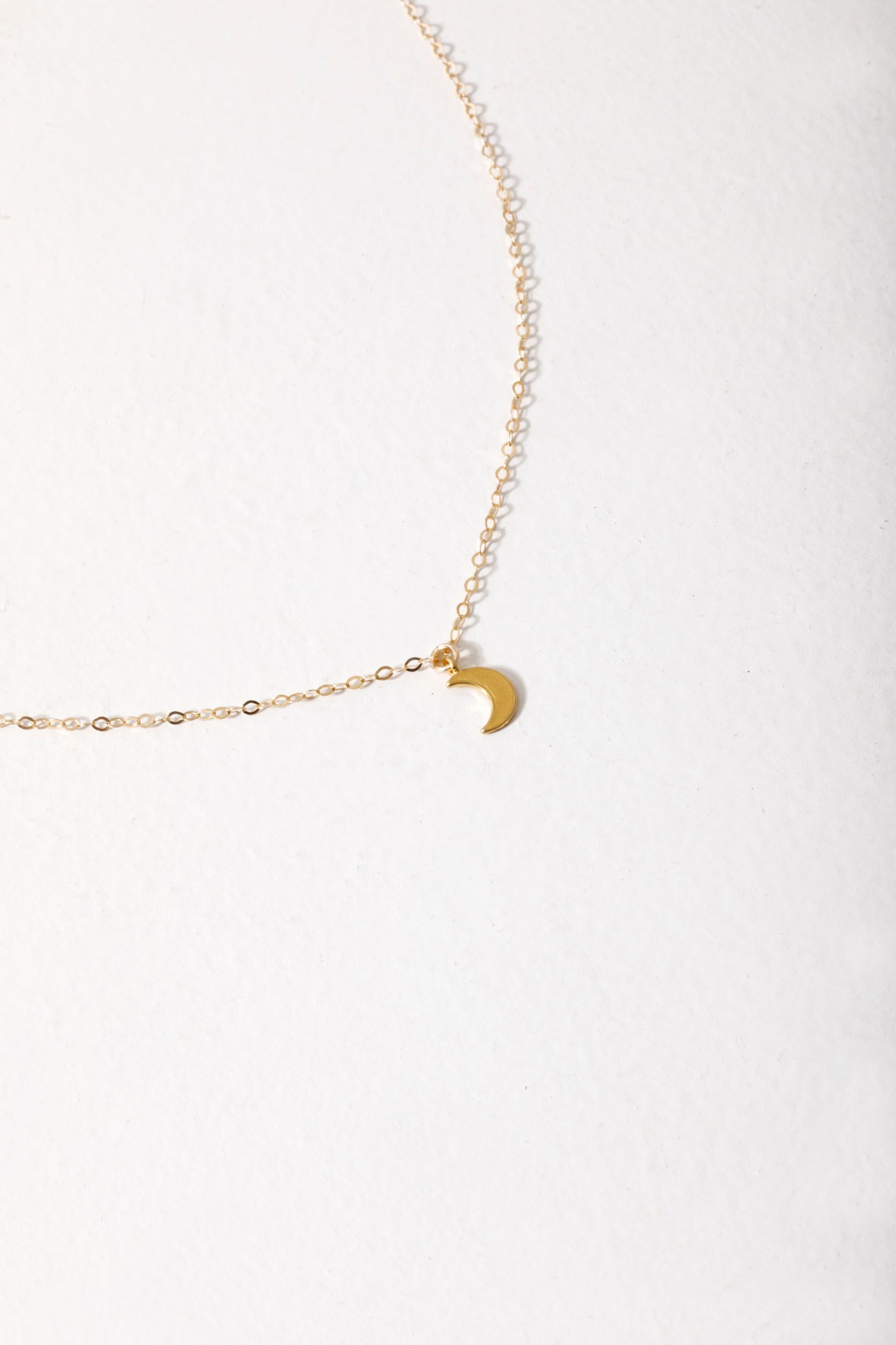 A dainty crescent moon charm in vermeil (gold plated sterling silver) on a 14k gold-filled chain. Also available in sterling silver.