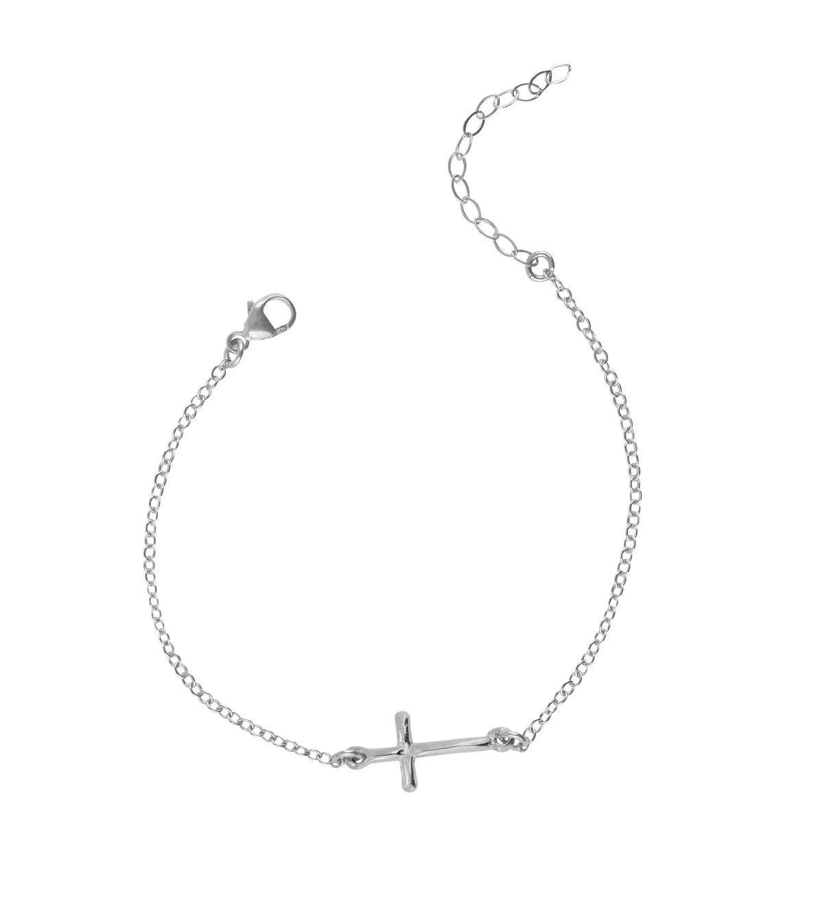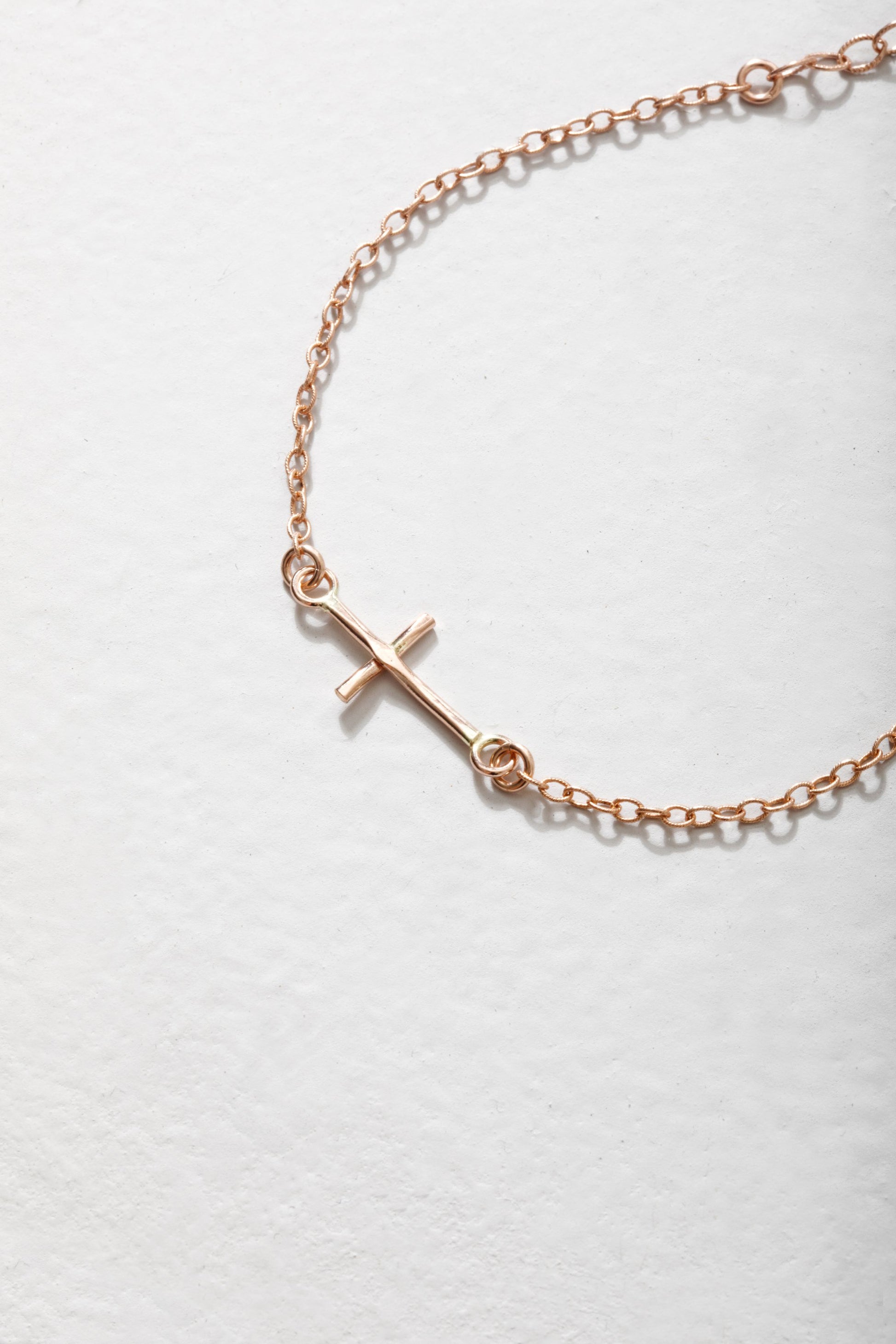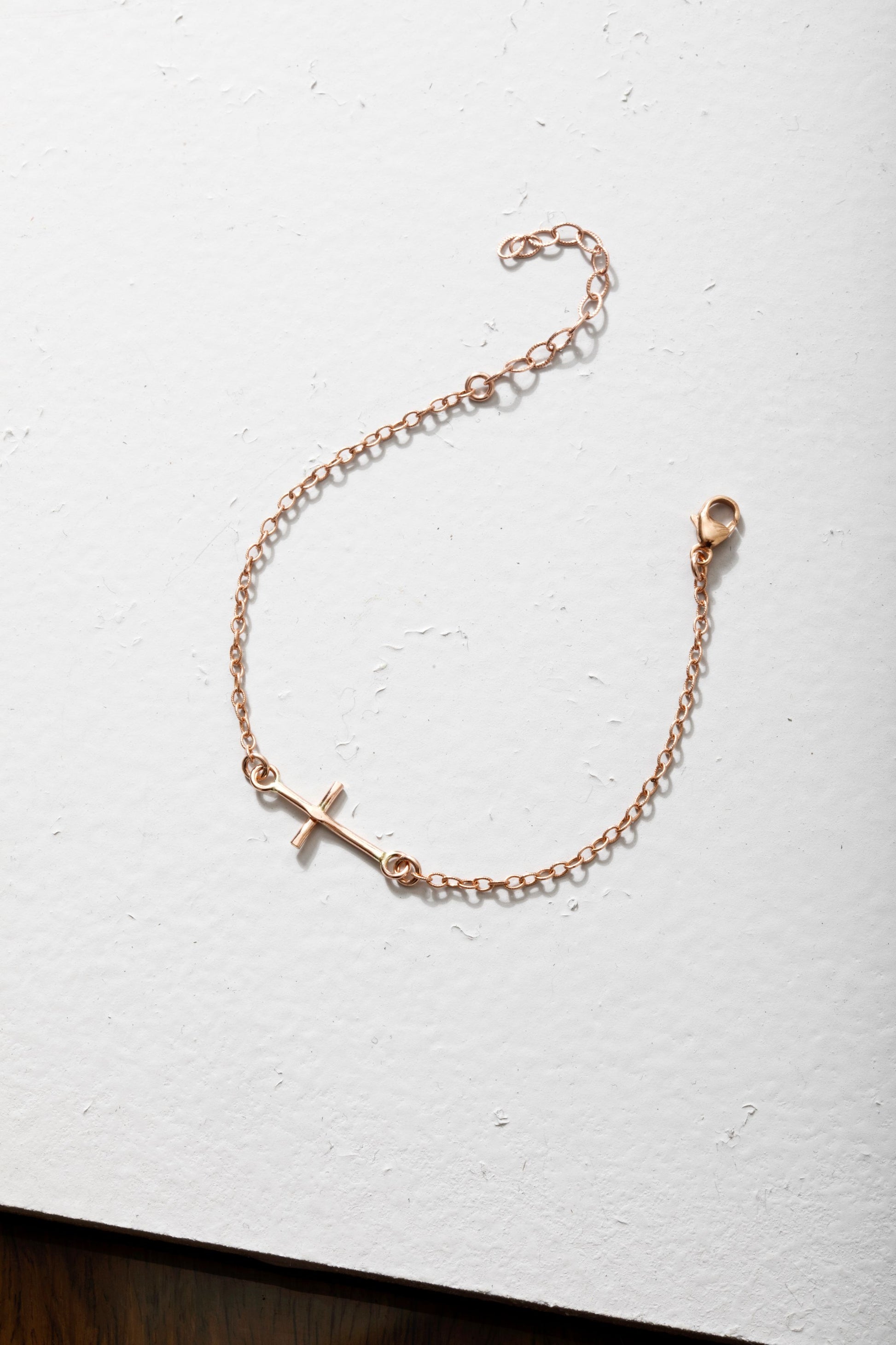 Cross bracelet available in sterling silver, 14k gold-filled, and rose gold-filled chain.