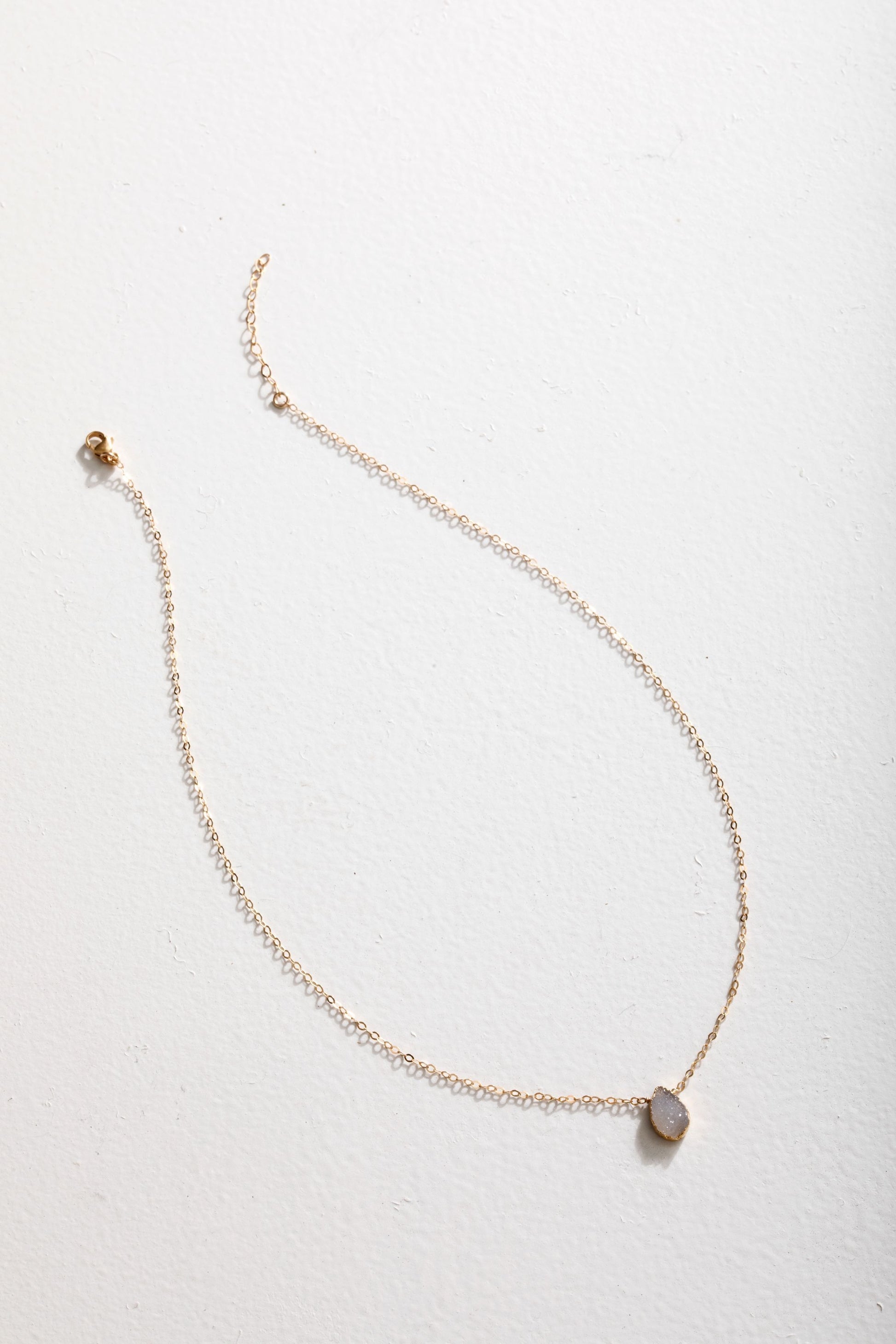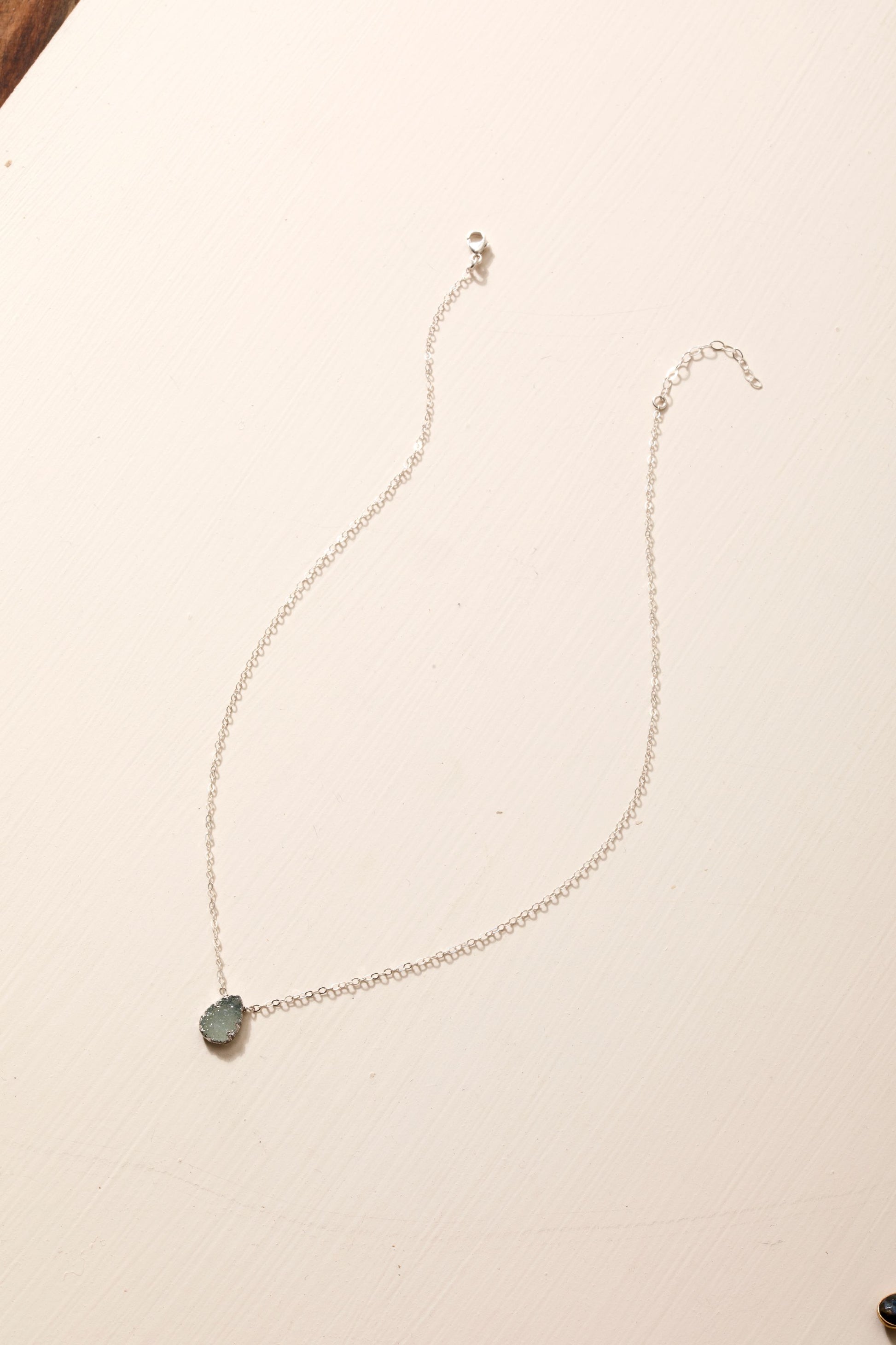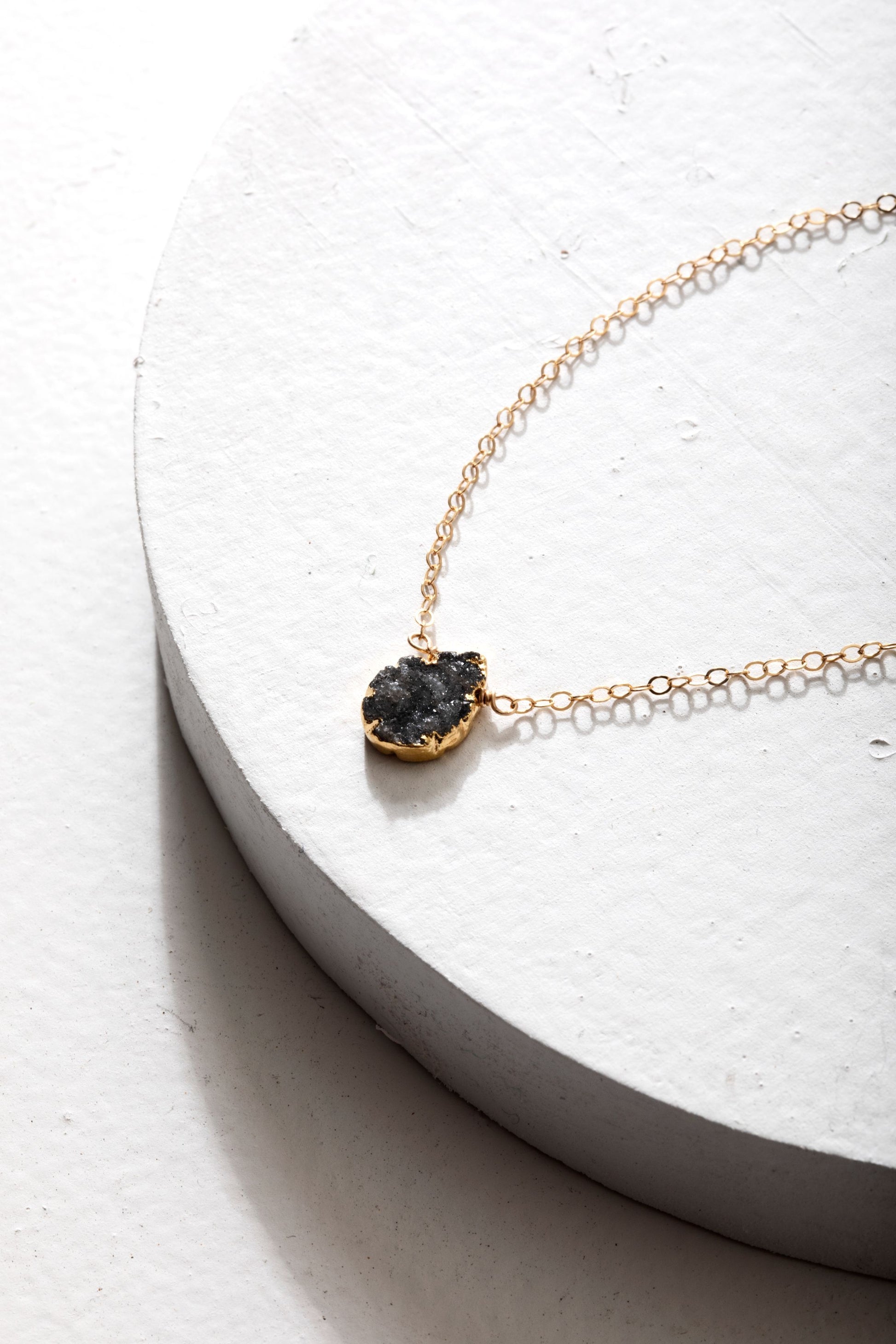 A gorgeous dark blue or light blue druzy stone on a 14k gold-filled chain. This pieces catches the light in such a beautiful way and adds a bit of sparkle to your everyday look.