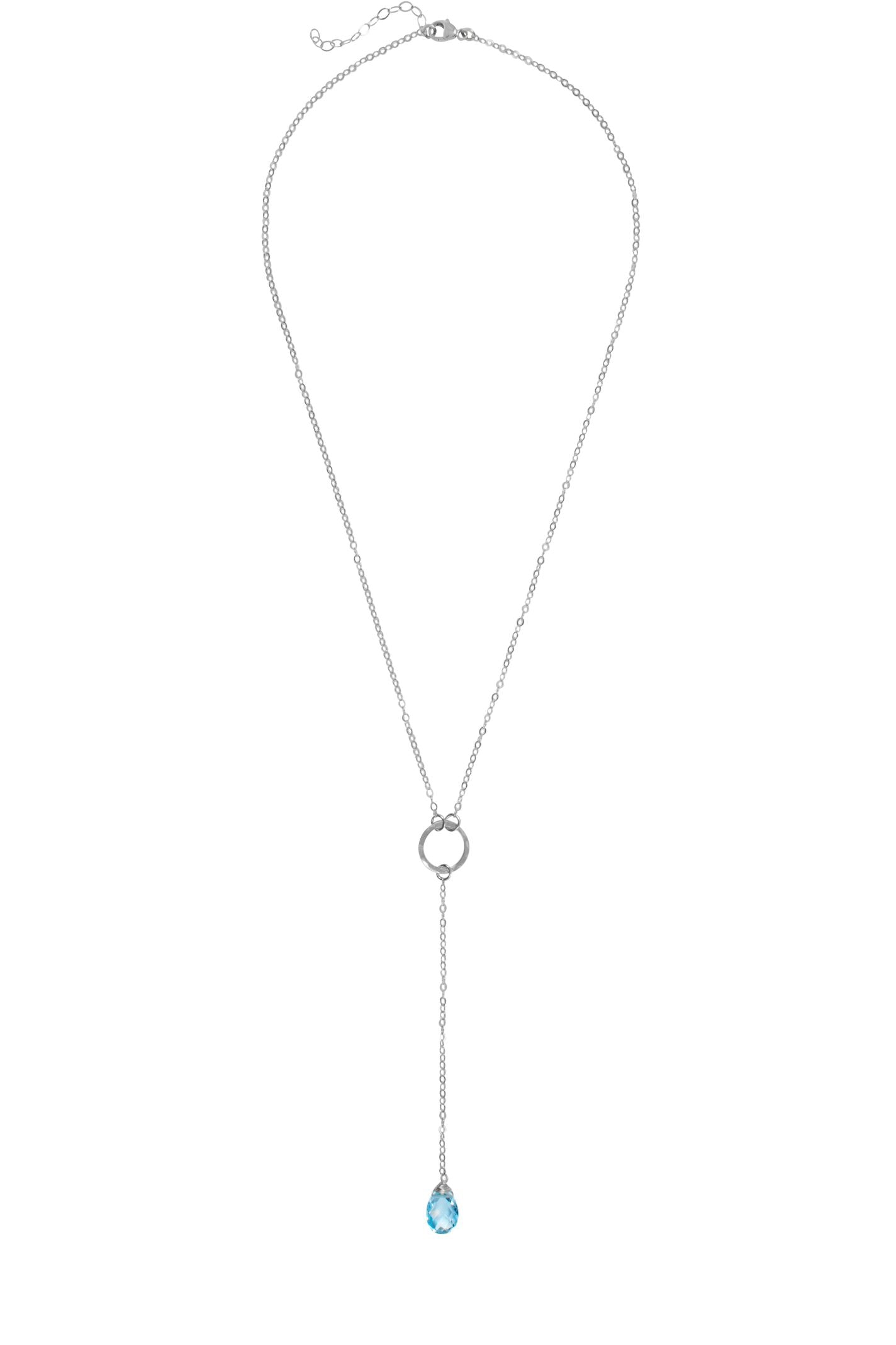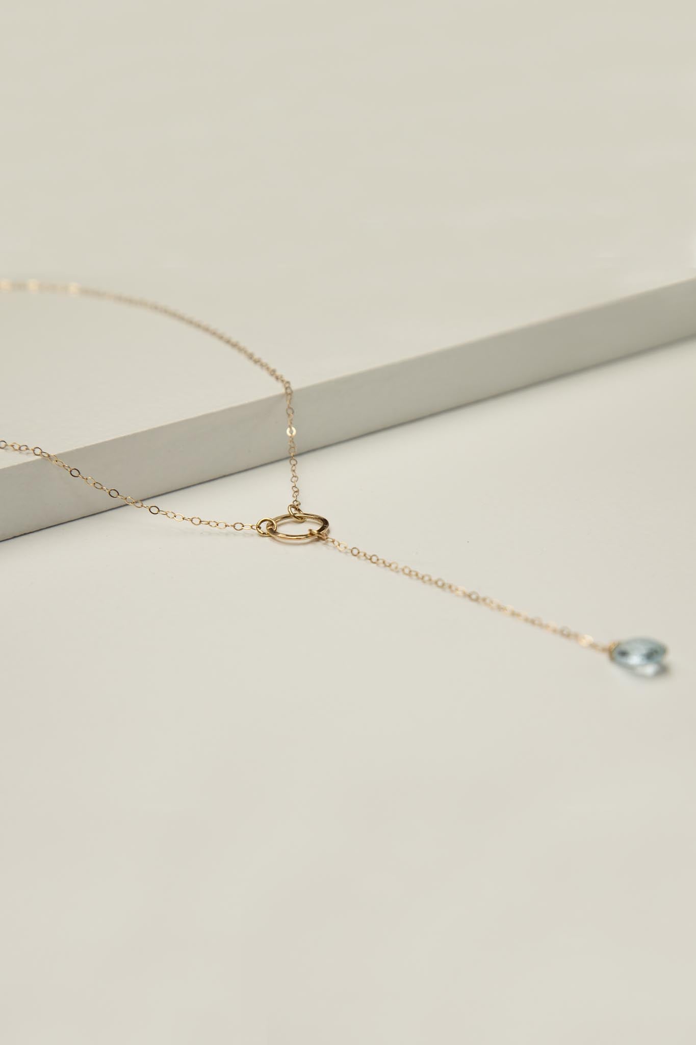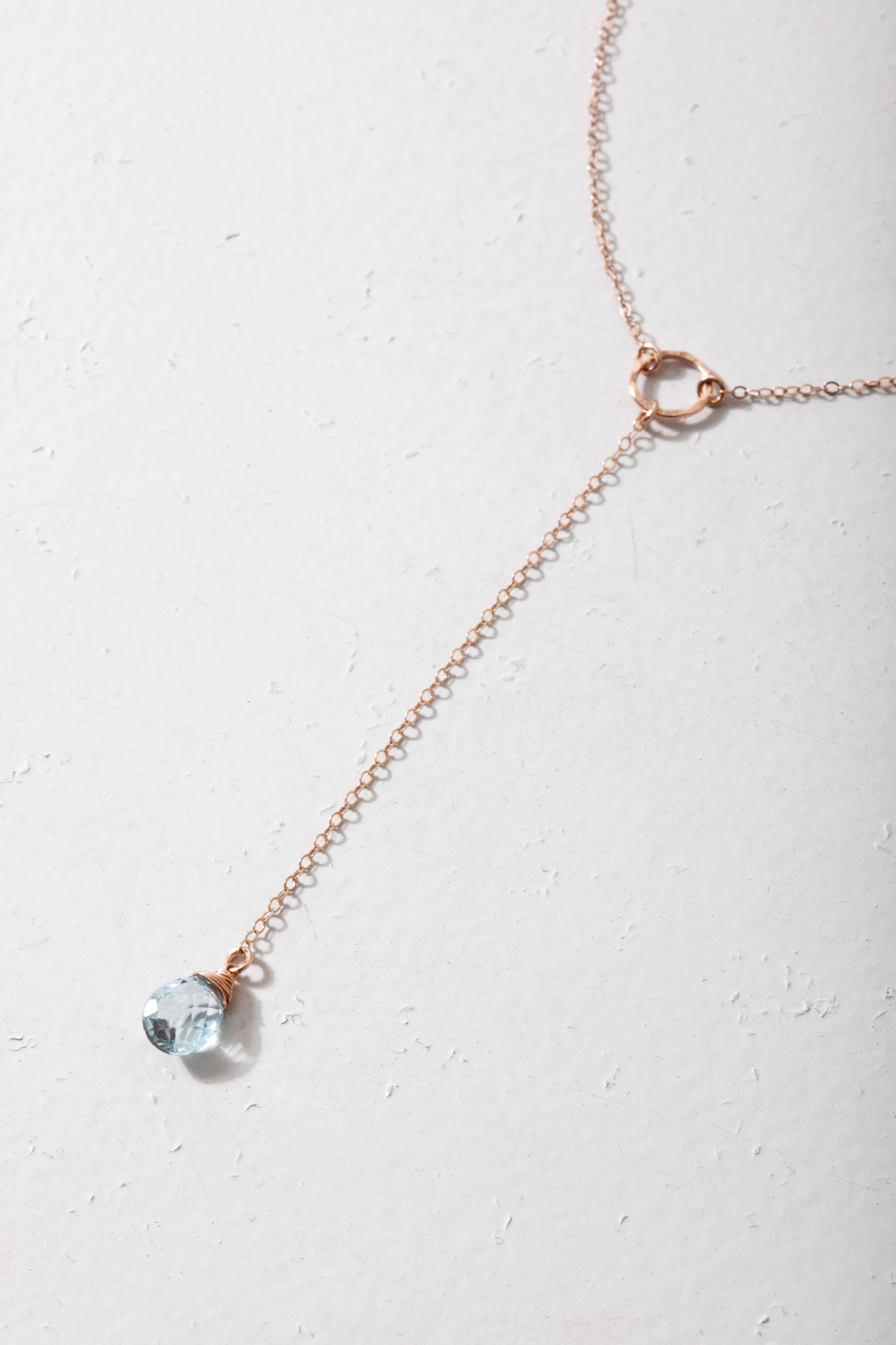 A delicately wire-wrapped precious blue topaz stone on a 14k gold-filled chain. Also available in 14k rose gold-filled and sterling silver.