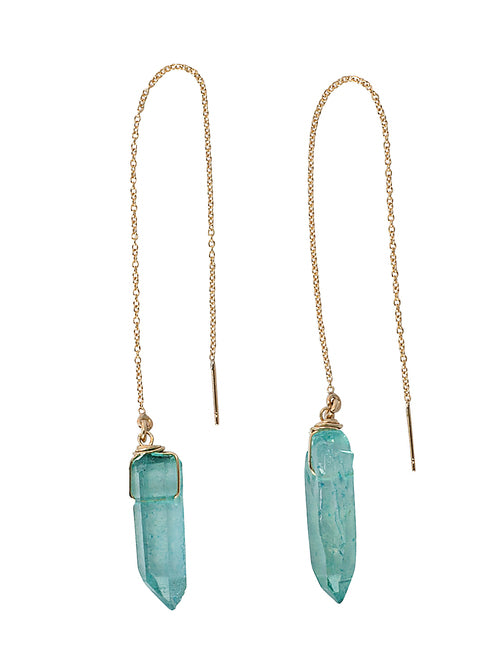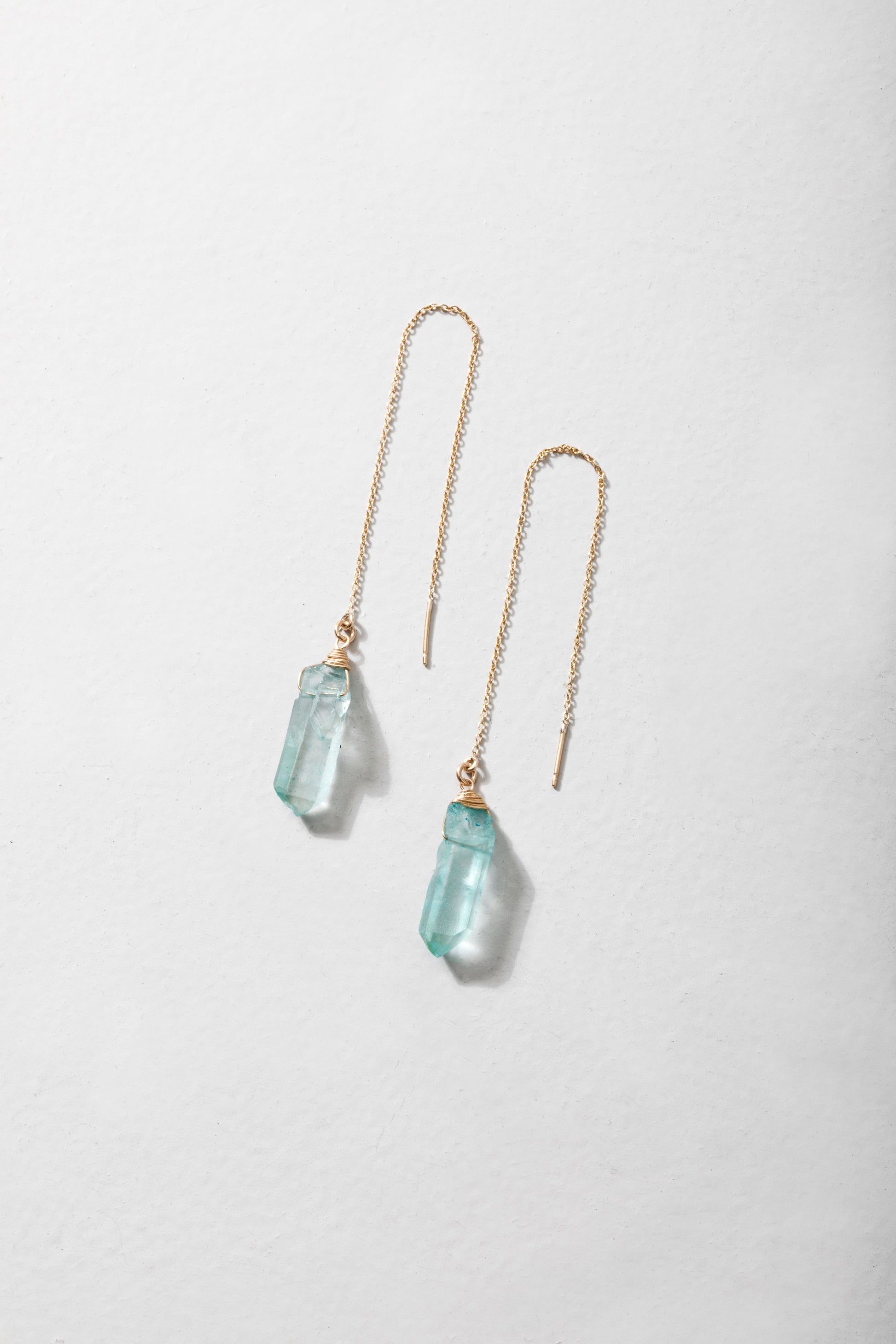 Delicately wire-wrapped aqua aura crystal quartz earrings, available in 14k gold-filled and sterling silver. These crystals are rare and vibrant in color, sourced all the way from Singapore.
