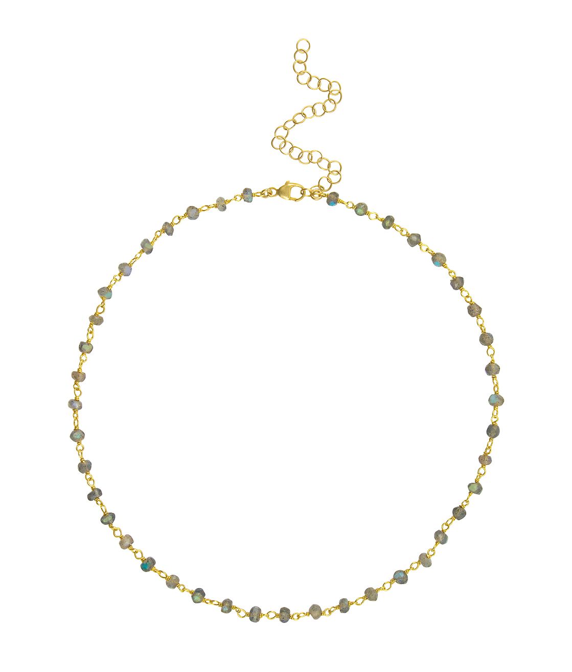 Labradorite stones on a gold plated over sterling silver chain with an added extension chain to ensure a perfect fit. Can also doubles as a bracelet.