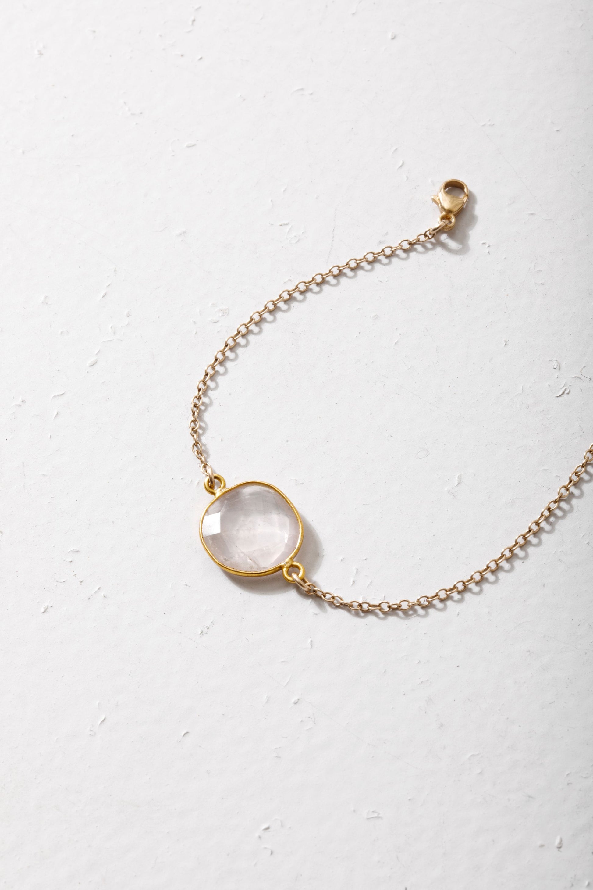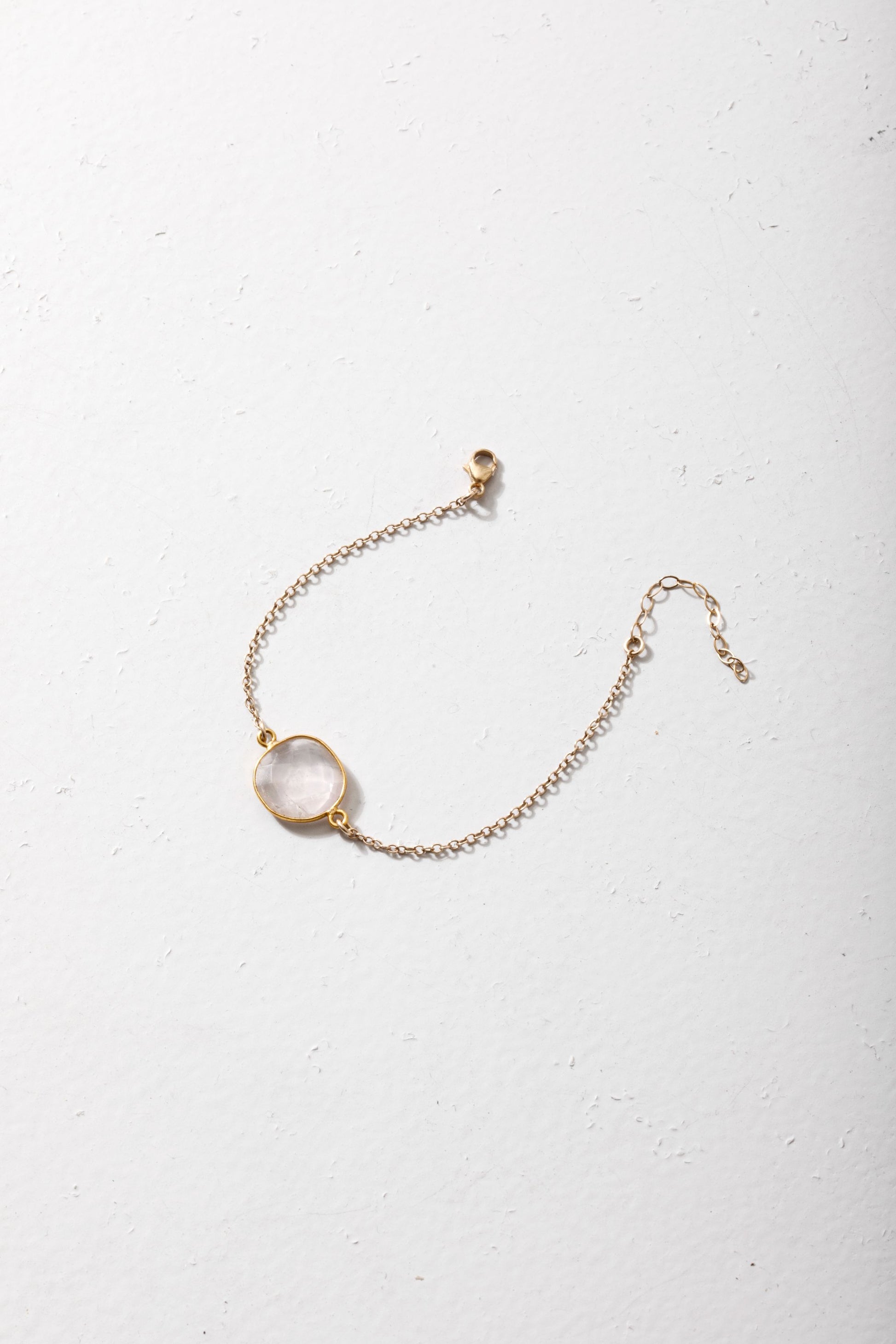 This delicate bracelet is made with rose quartz in a vermeil (gold plated over sterling silver) setting with a 14k gold-filled chain. Added extension chain to ensure a perfect fit.