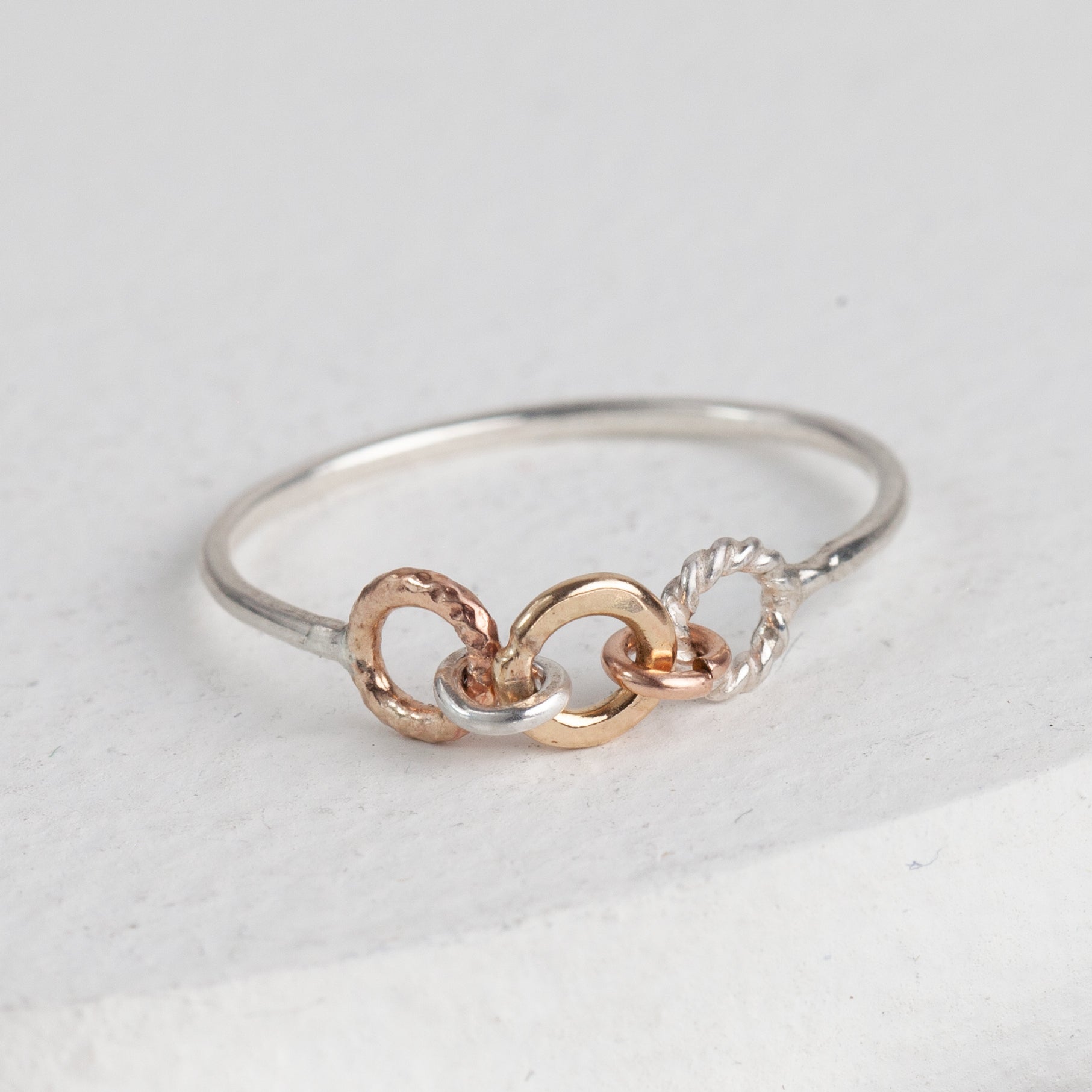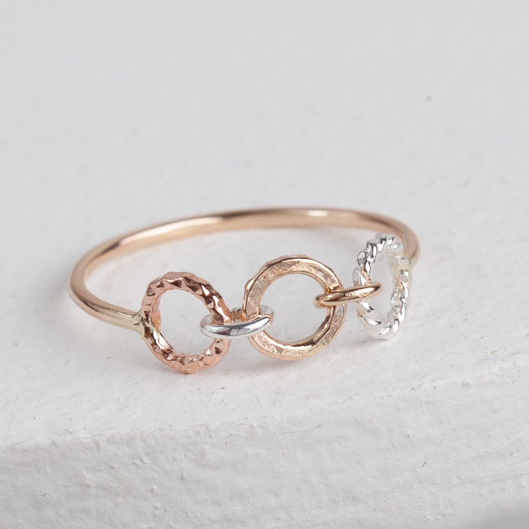 This collection includes a delicate necklace with three circles linked together- one in rose gold, silver, and gold. The three circles in the design represent love, solidarity, and peace. Other pieces include a bracelet, ring, and threader earrings with the same color options. The ring design is available in any size as they are made to order, just email us the desired sizing option after checkout!