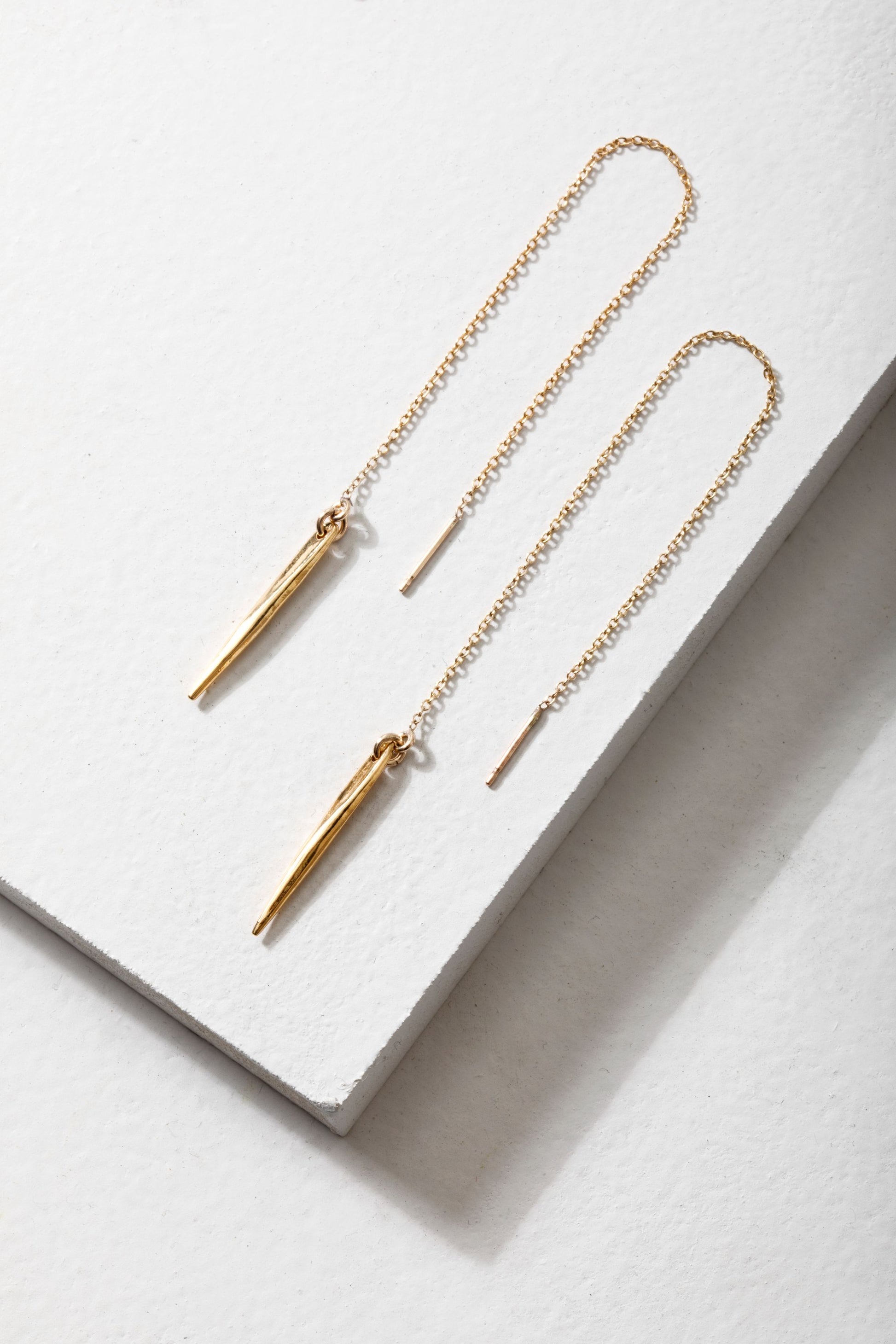 Spike pendants comes in both gold plated sterling silver and sterling silver with a 14k gold-filled or sterling silver earring chain. Earring backings are included so as to adjust and hold the earring at whichever length is desired.