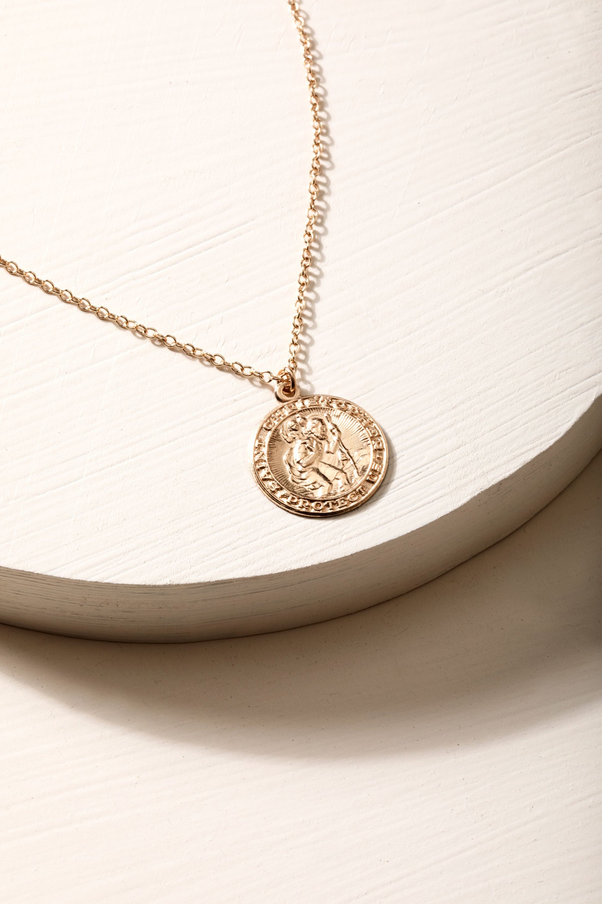 14K Gold-filled Saint Christopher pendant (approximately the size of a quarter) on a delicate quality chain. Also available in solid 925 silver.