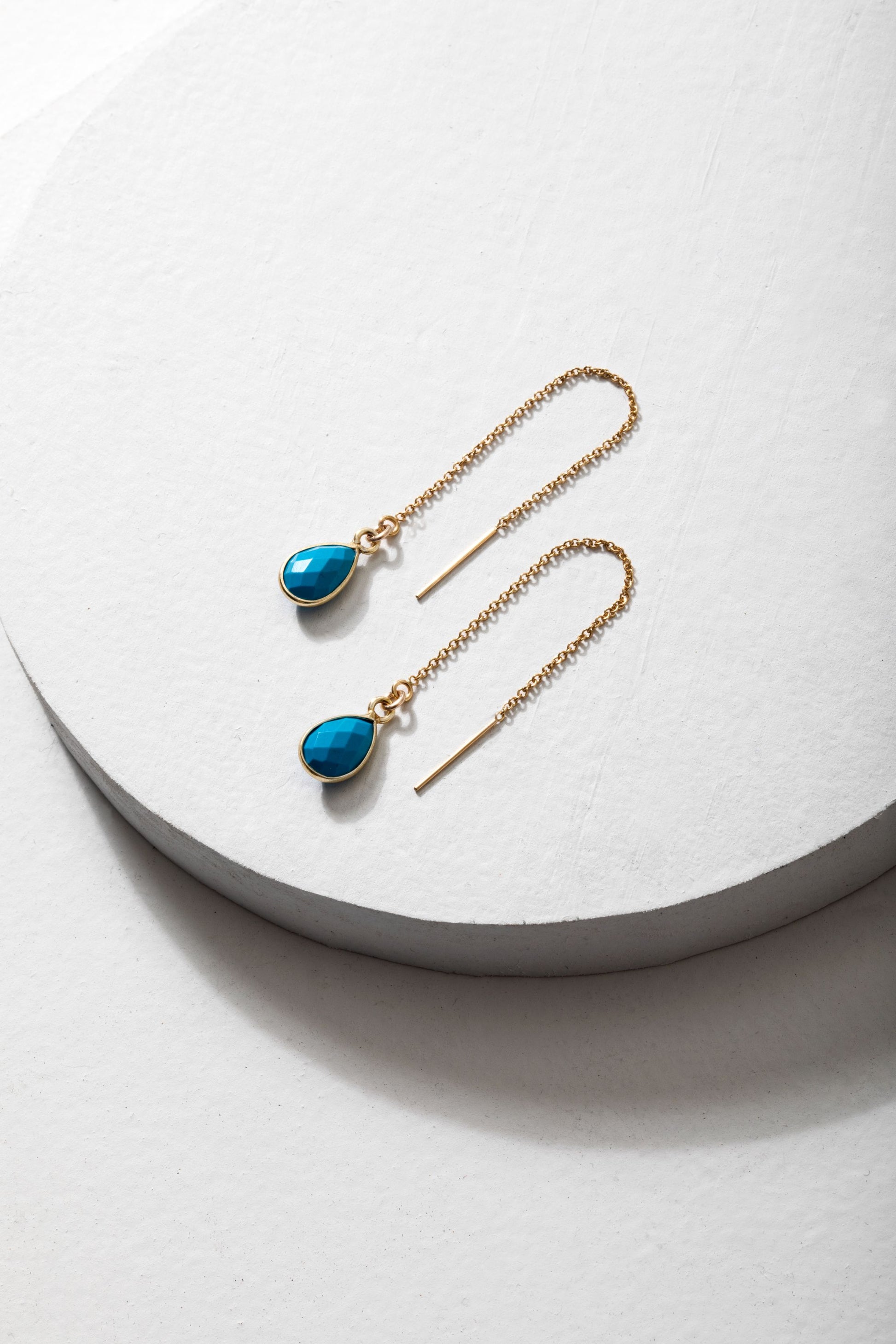 Bezeled turquoise earrings with 14k gold-filled earring chain. Also available in sterling silver.