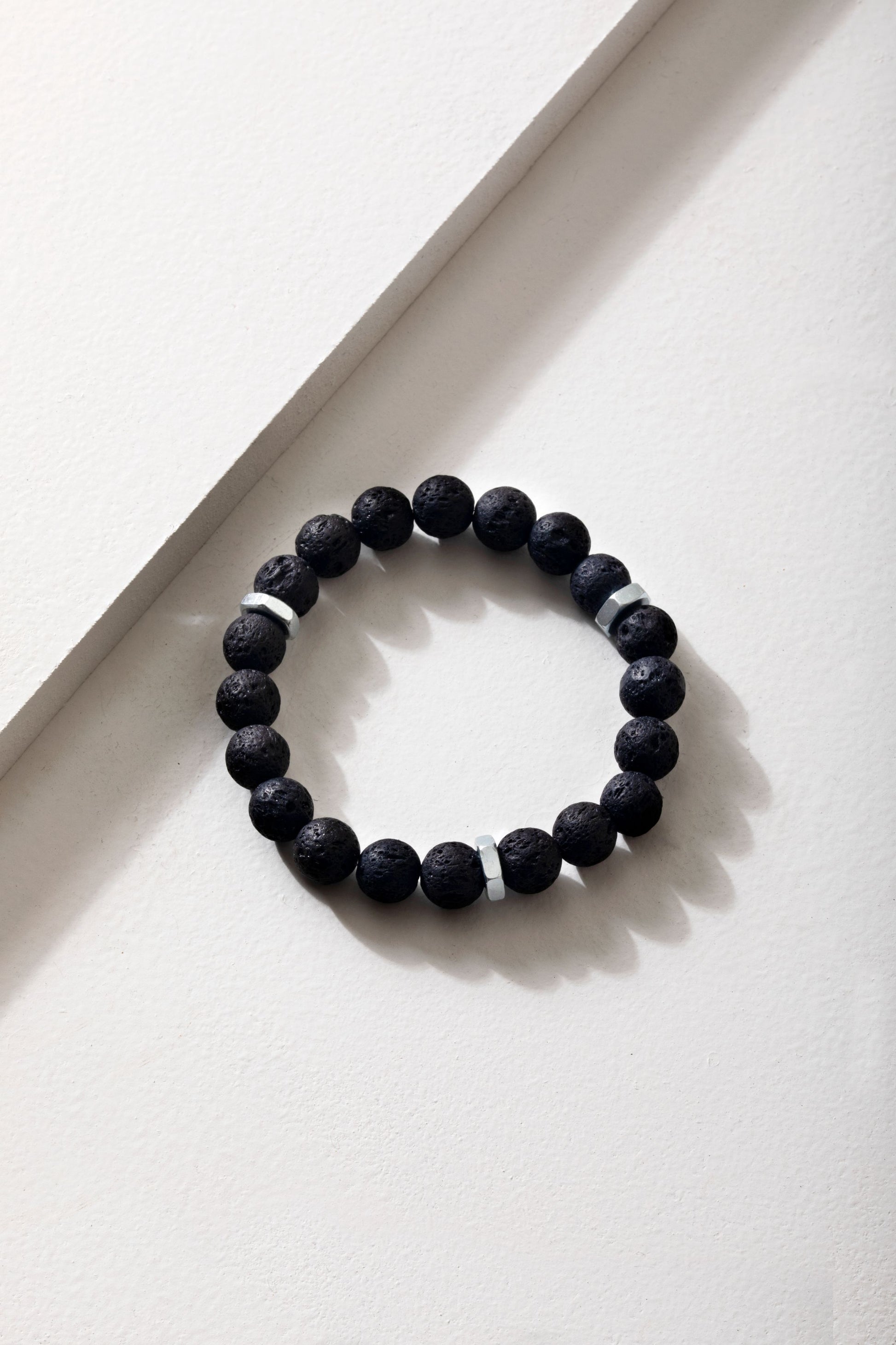 This bracelet is made with volcanic rock stones and zinc nuts - a very industrial style piece.